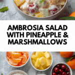 Ambrosia Salad is a classic creamy fruit salad featuring a delightful combination of pineapple, mandarin oranges, shredded sweetened coconut, preserved cherries, pecans, and mini fruit-flavored marshmallows all folded into whipped topping and vanilla yogurt, making it a refreshing and sweet treat perfect for gatherings or as a light dessert.