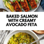 - Serve: Remove the salmon from the oven and immediately spoon the chilled avocado-feta topping over each fillet. Serve right away for the best flavor and texture.