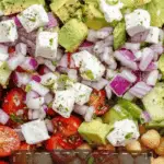 A fresh and vibrant Chickpea Feta and Avocado Salad combining the creaminess of avocado and feta cheese with crisp cucumbers, juicy cherry tomatoes, and a zesty lemon-garlic dressing. This wholesome, no-cook salad is perfect for a quick, healthy meal or side dish.