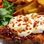 This Crispy Hot Honey Feta Chicken recipe combines juicy, perfectly fried chicken breasts coated in a flavorful, crunchy panko crust with a spicy-sweet hot honey glaze and a rich, creamy feta topping. The chicken is seasoned with paprika and aromatic spices, pan-fried until golden and crispy, then finished under the grill to melt and slightly brown the feta cheese. It’s a delightful fusion of heat, sweetness, and tangy creaminess, perfect for a satisfying dinner.