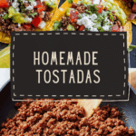 Homemade Tostadas are a quick and easy Mexican-inspired meal, featuring crispy tortillas topped with seasoned beef, refried beans, fresh veggies, and crumbled cheese. Perfect for a customizable family dinner!