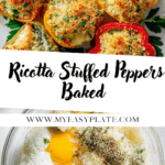 These herby ricotta stuffed peppers are a delicious and comforting vegetarian dish featuring bell peppers filled with a flavorful mixture of ricotta, mozzarella, fresh herbs, spinach, and parmesan, topped with a crispy breadcrumb crust and baked to golden perfection.