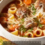 This rustic and delicious Italian Meatball Soup is packed with homemade savory meatballs, tender pasta, and fresh vegetables all simmered in a rich tomato broth. Ready in under an hour, it’s a comforting and hearty meal perfect for any weeknight dinner.