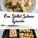 This easy one skillet salmon gnocchi recipe with spinach and crème fraîche is a perfect quick and delicious weeknight dinner. Ready in just 10 minutes, all ingredients are cooked together in a single frying pan for minimal cleanup. Tender seared salmon combines with pillowy gnocchi, fresh spinach, creamy crème fraîche, and tangy lemon juice for a rich and satisfying meal.