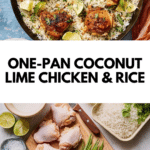 This One-Pan Coconut Lime Chicken and Rice is a flavorful, easy-to-make dish combining tender chicken thighs with fragrant jasmine rice cooked in creamy coconut milk, tangy lime, and aromatic spices. Perfectly crisped chicken skin and a medley of fresh herbs and spices deliver a delicious tropical twist in just one pan, making it a convenient and impressive weeknight meal.