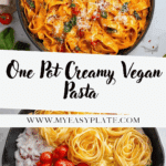 This One Pot Creamy Pasta is a quick and easy vegan dish perfect for a comforting weeknight meal. Made by simmering pappardelle pasta with cherry tomatoes, spinach, and a creamy plant-based sauce all in one skillet, it delivers rich flavors without the hassle of multiple pots. The combination of tomato paste and plant-based cream creates a luscious sauce that coats the pasta perfectly, while fresh parsley and vegan parmesan add a fragrant finishing touch.
