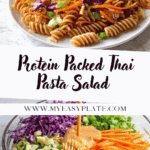 This Protein Packed Thai Pasta Salad is a vibrant, nutritious dish perfect for a quick lunch or light dinner. Featuring garbanzo bean rotini pasta tossed in a creamy, tangy peanut dressing with fresh cabbage, carrots, cucumber, and scallions, this salad offers a delicious balance of protein, fiber, and bold Thai-inspired flavors. Ready in just 20 minutes, it’s an easy and satisfying meal that combines the best of pasta and salad in one colorful bowl.