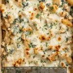 A creamy and comforting Spinach Artichoke Chicken Casserole combining tender pasta, cooked chicken, spinach, artichokes, and a rich cheese sauce, baked to bubbly perfection with a golden mozzarella topping.