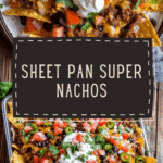 These sheet pan Super Nachos are loaded with seasoned ground beef, black beans, homemade nacho cheese sauce, and plenty of shredded cheese. Perfect for game day or parties, just top with your favorite fixings and serve hot!
