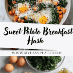 This Sweet Potato Breakfast Hash is a vibrant and nourishing morning dish featuring crispy sweet potatoes, sautéed kale, red onions, and perfectly cooked eggs. Enhanced with spices like garlic powder and paprika, and topped with parmesan cheese and crushed red pepper flakes, it offers a flavorful and hearty start to your day.
