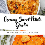 This Sweet Potato Gratin is a creamy, cheesy, and flavorful dish featuring thinly sliced sweet potatoes layered with gruyere and parmesan cheeses, fresh thyme, and seasoned with garlic and black pepper. Baked to golden perfection, it makes an irresistible side that combines the natural sweetness of sweet potatoes with savory, melted cheese, perfect for family dinners or holiday meals.